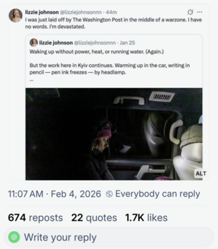There will be dozens of stories about the individuals leaving The Washington Post. But one already stands out. Journalist Lizzie Johnson received notice that she was laid off—while working in the middle of a war zone. Lizzie is—rather, was—their Ukraine correspondent. Her post on social media, “I have no words. I’m devastated.”